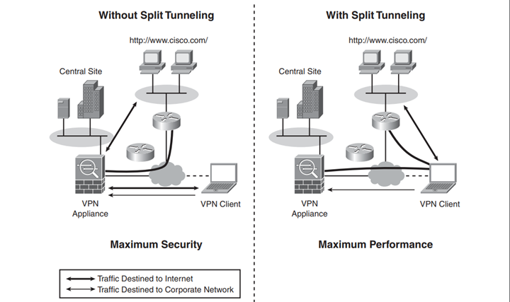 In a remote access VPN deployment, split tunneling gives the user direct access to a public network and VPN access to a private network simultaneously. The end user's computer becomes an extended Internet entry point to the corporate network. If no proper security measures are in place on the end user's computer, attackers have opportunities to compromise the computer from the Internet and gain access to the internal network through the VPN tunnel. For this reason, many organizations choose to disable split tunneling in their remote access VPN deployment. Figure 3-1 illustrates the split tunneling topology.